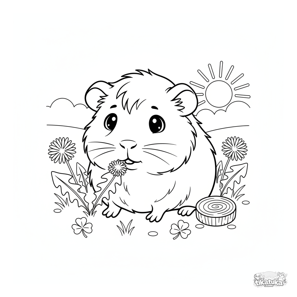 Ausmalbild eines süßen Meerschweinchens auf einer Wiese. Für Kinder von 4-6 Jahren. Ein flauschiges, langhaariges Meerschweinchen knabbert an einem Löwenzahnblatt zwischen Klee.
