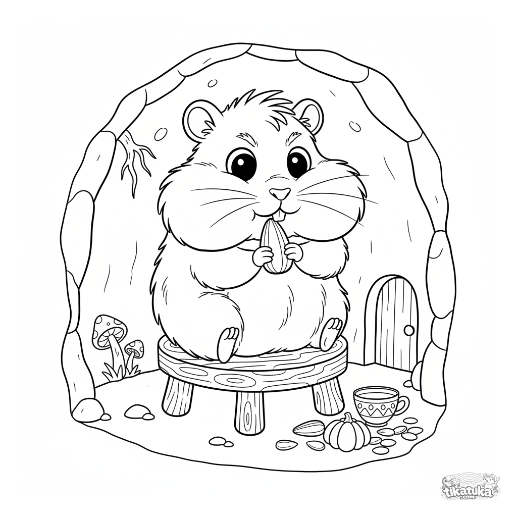 Ausmalbild eines süßen, flauschigen Hamsters, der auf einem Hocker in seinem Bau sitzt. Für Kinder von 3-6 Jahren.