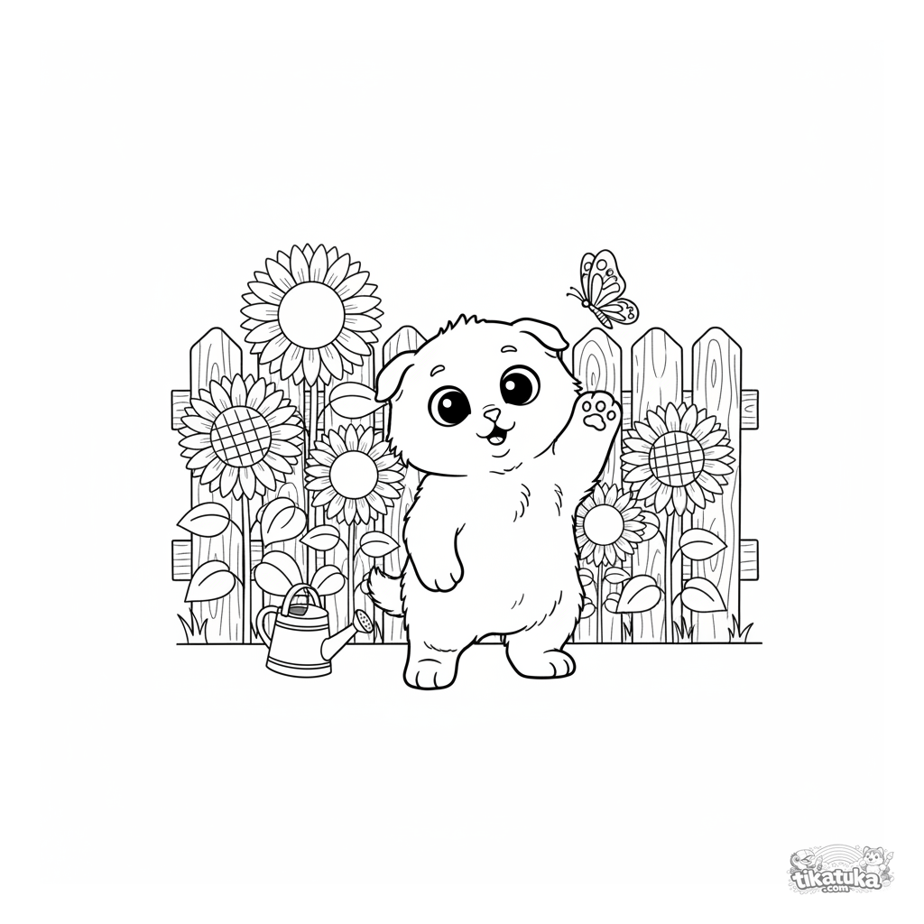 Ausmalbild eines süßen Schottischen Faltohrkätzchens, das einem Schmetterling in einem Sonnenblumenfeld nachjagt. Für Kinder von 3-6 Jahren.