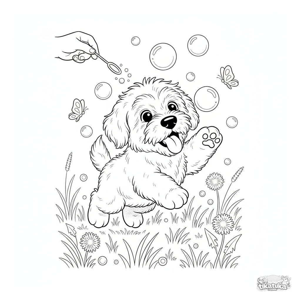 Ausmalbild für Kinder 4-6: Ein flauschiger Schäferhundwelpe spielt fröhlich auf einer Wiese und jagt schwebende Seifenblasen. Einfache Formen und niedliche Szene.