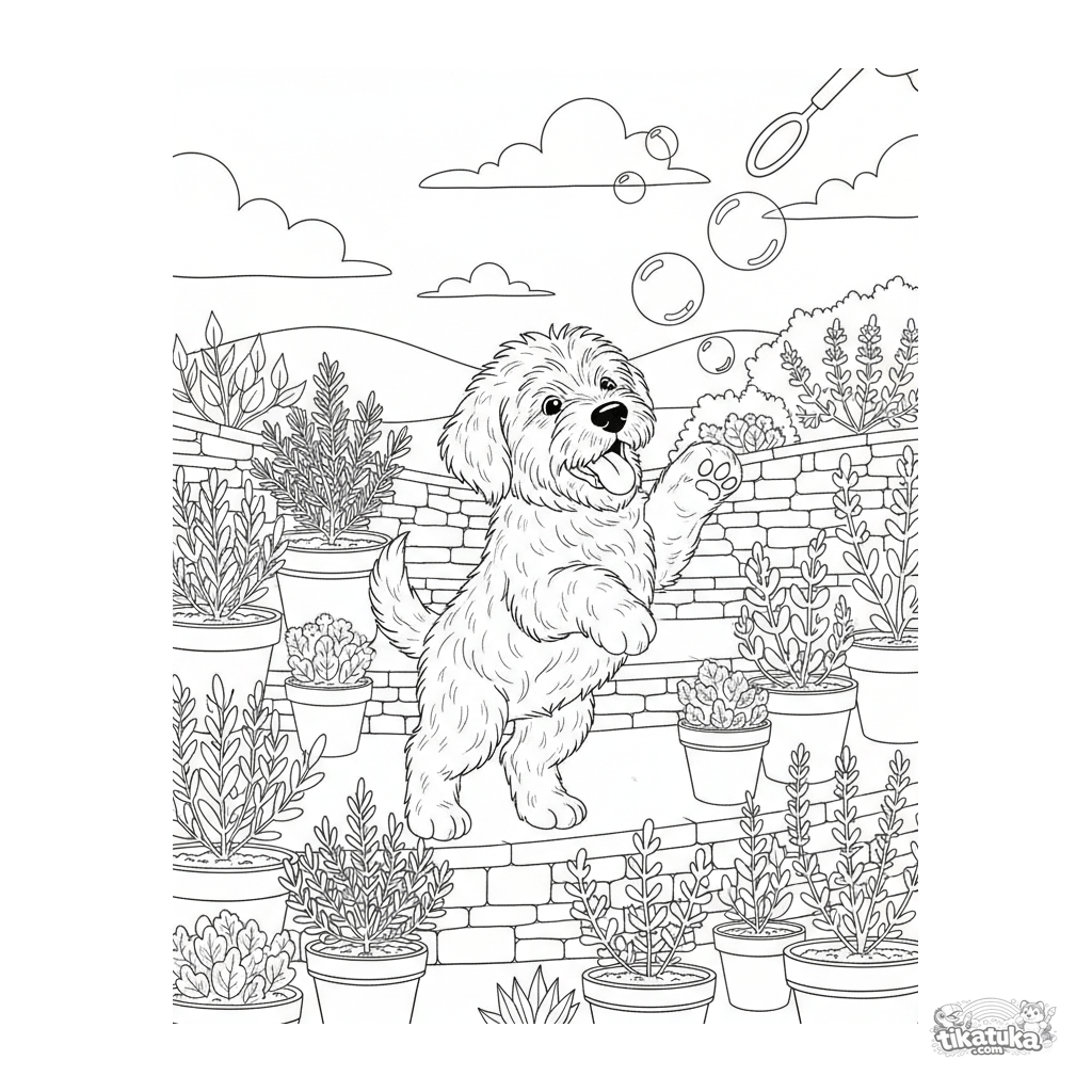 Ausmalbild eines Schäferhundwelpen im Garten. Für Kinder von 6-9 Jahren. Der flauschige Welpe springt fröhlich und verfolgt Seifenblasen zwischen Topfkräutern.