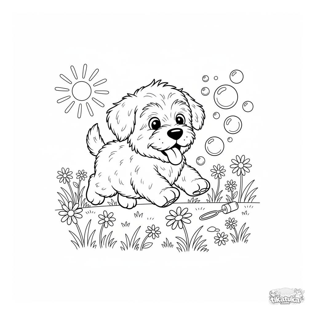 Ausmalbild eines flauschigen Schäferhundwelpen, der fröhlich Seifenblasen auf einer Wiese jagt. Für Kinder von 3 bis 6 Jahren.
