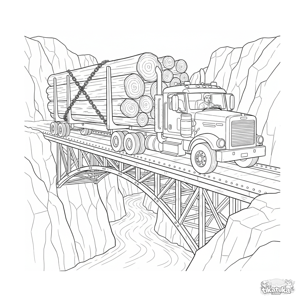 Ausmalbild für ältere Kinder 10-12: Ein langer Holz-LKW mit Baumstämmen überquert vorsichtig eine alte Stahlbrücke über einer Flussschlucht.