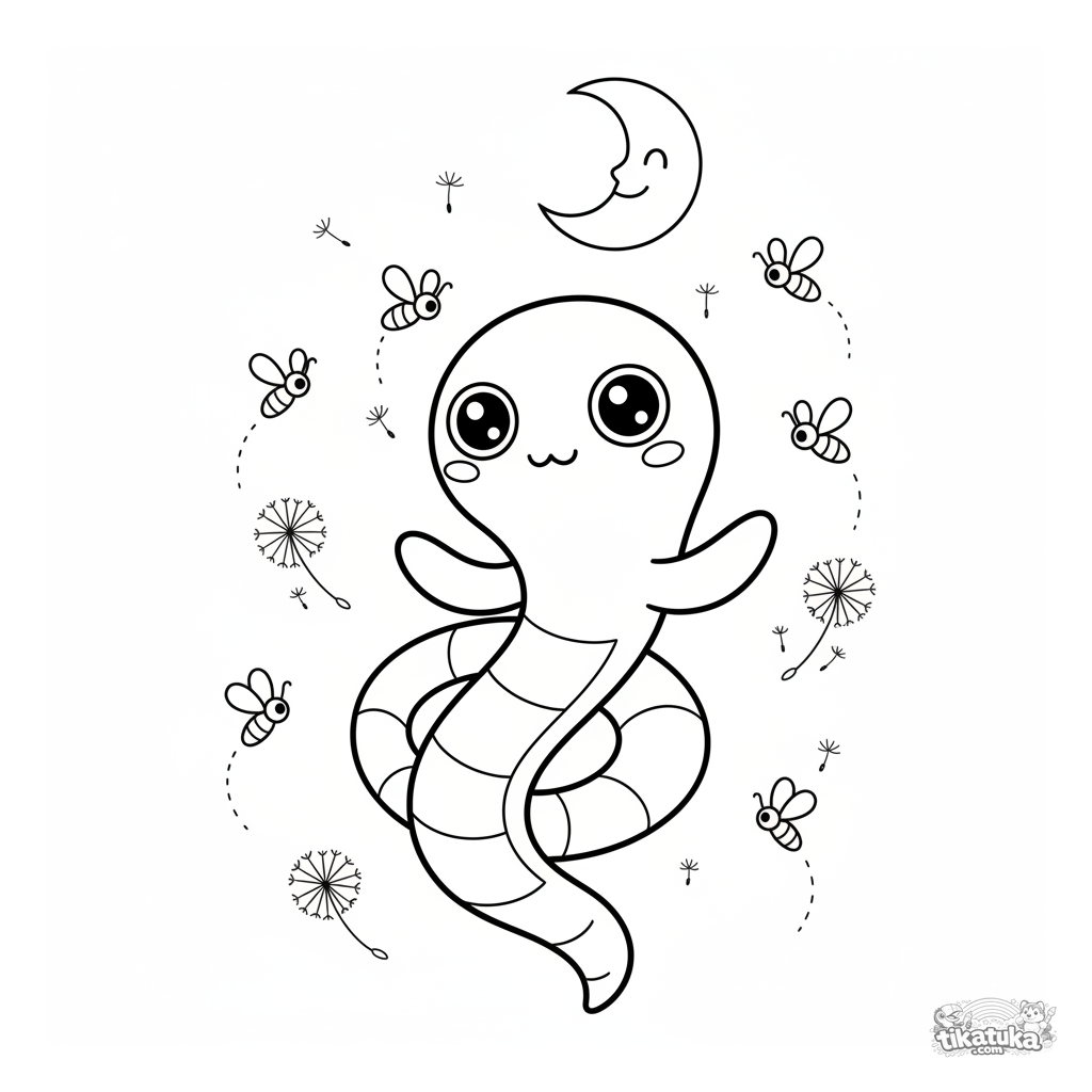 Ausmalbild für Kinder: Ein langes, fließendes Monster tanzt anmutig in einem mondbeschienenen Garten, umgeben von Glühwürmchen. Eine ruhige Szene.