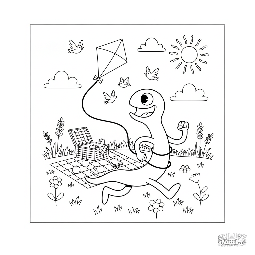 Ausmalbild für Kinder 7-9: Ein langes, gestrecktes Monster rennt fröhlich über eine Wiese und lässt auf einem Picknick einen Drachen steigen. Eine dynamische und glückliche Actionszene.