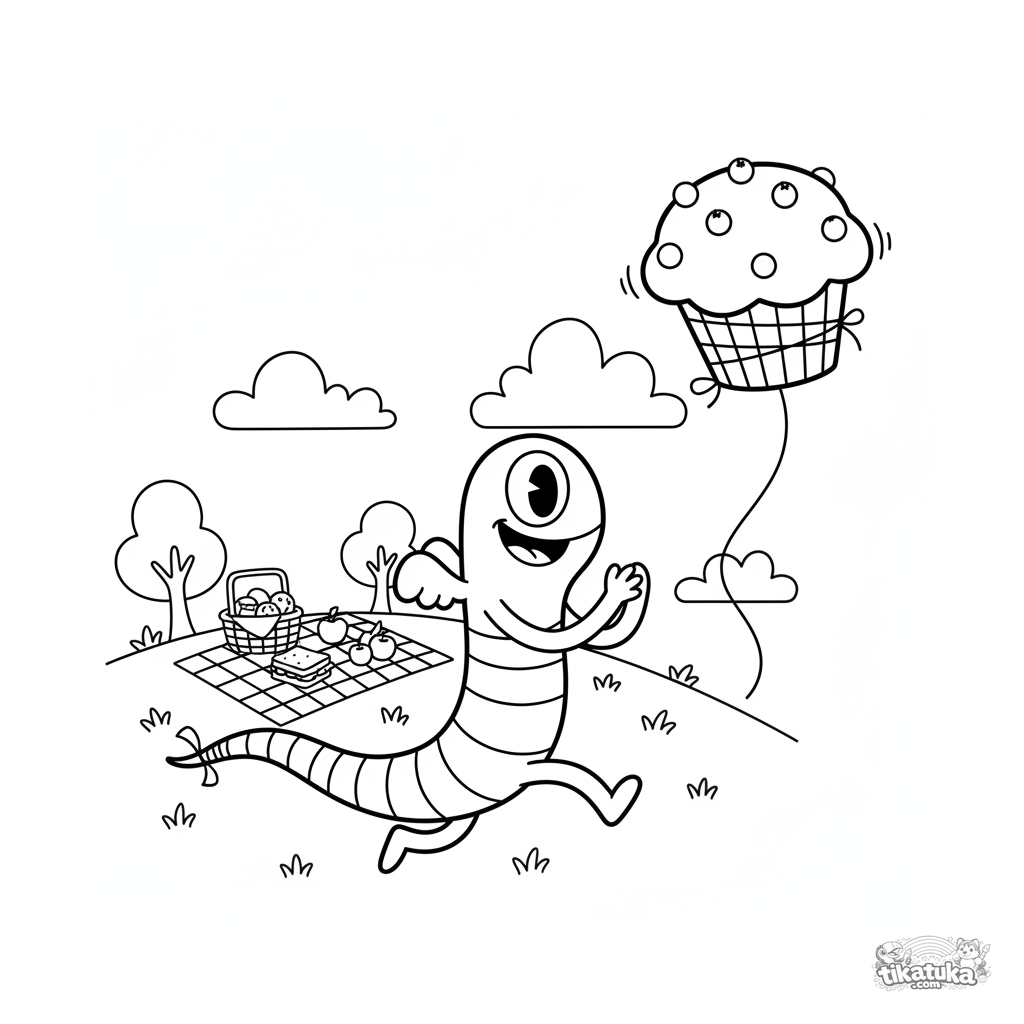 Ausmalbild für Kinder von 4-6 Jahren: ein langes gummiartiges Monster lässt einen Drachen in Form eines Blaubeer-Muffins auf einem Hügel beim Picknick steigen. Lustige Retro-Szene, einfache Linien.