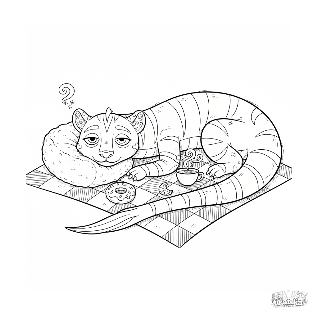 Detailliertes Ausmalbild für Kinder von 10-12 Jahren: ein langes gestreiftes Monster schläft auf einem Marshmallow-Kissen nach dem Picknick.