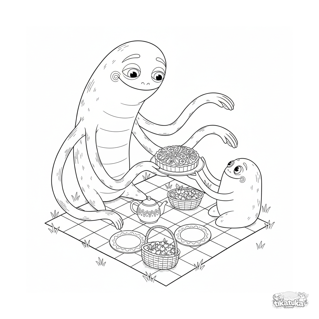 Detailliertes Ausmalbild für Kinder 10-12: Ein langes, gestrecktes Monster reicht einen Teller Obsttarte auf einem Picknick weiter. Dynamische Pose, Essensdetails.