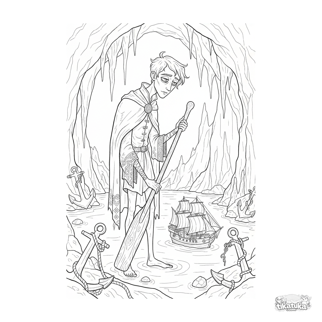 Detailliertes, atmosphärisches Ausmalbild für 10-12: der Geist eines alten Seemanns an einem unterirdischen See in Medusas Höhle. Aquarell-Skizzen-Stil.