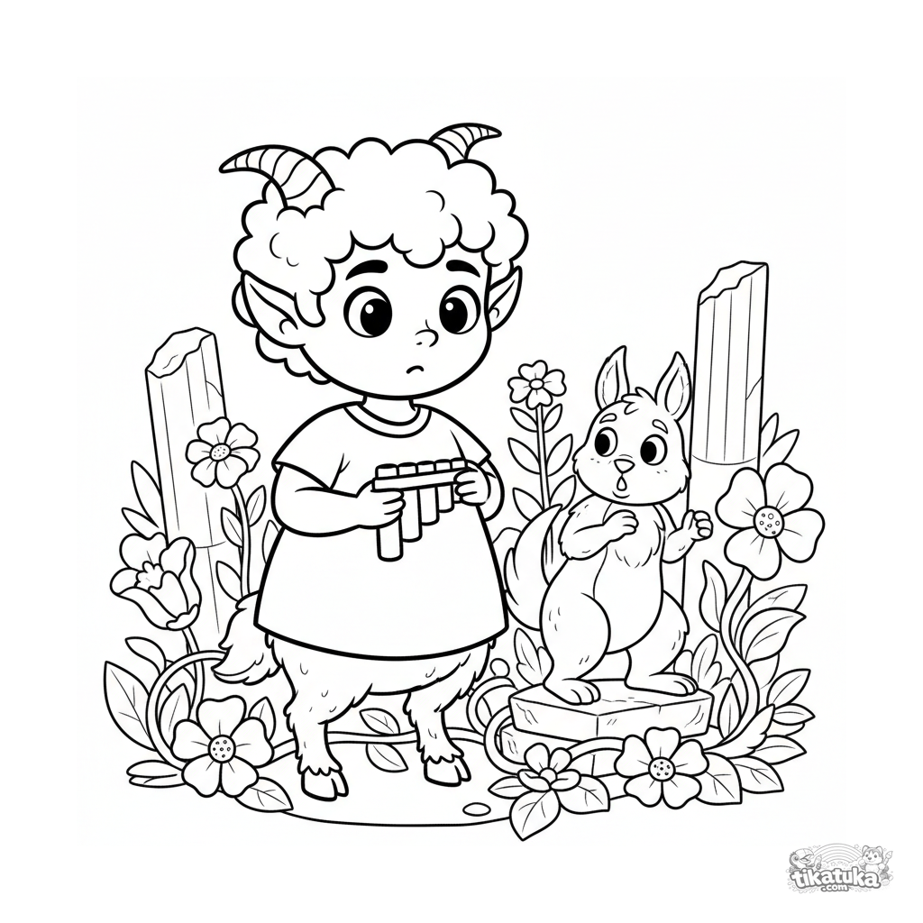 Ausmalbild für Kinder 4-6: Ein junger Satyr mit Ziegenbeinen und einer Panflöte sieht verwirrt in einem versteinerten Garten aus.