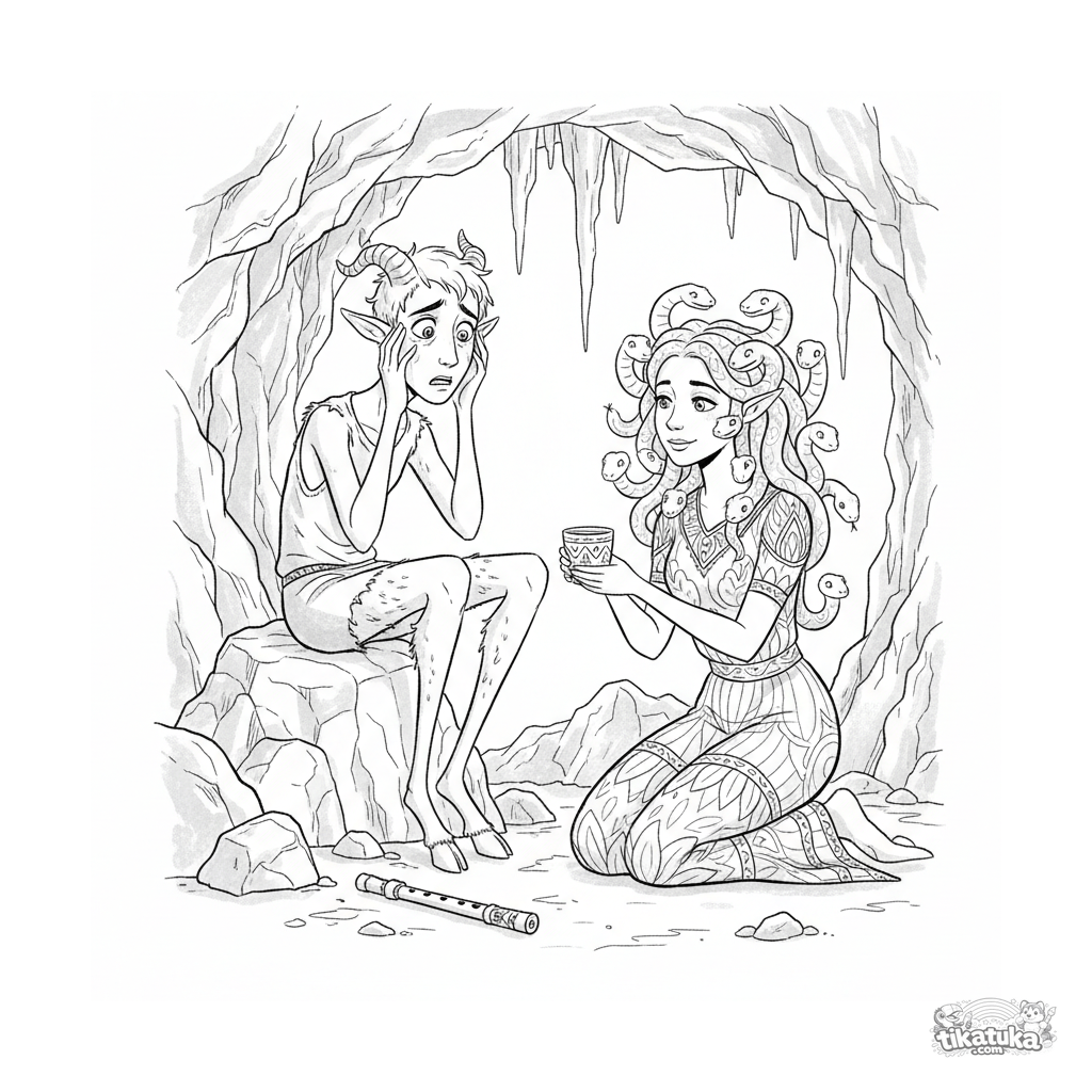 Detailliertes Ausmalbild für Kinder 10-12 im Skizzenstil: Eine mythische Gorgone zeigt Freundlichkeit, indem sie einem verlorenen jungen Satyr in ihrer Höhle hilft.