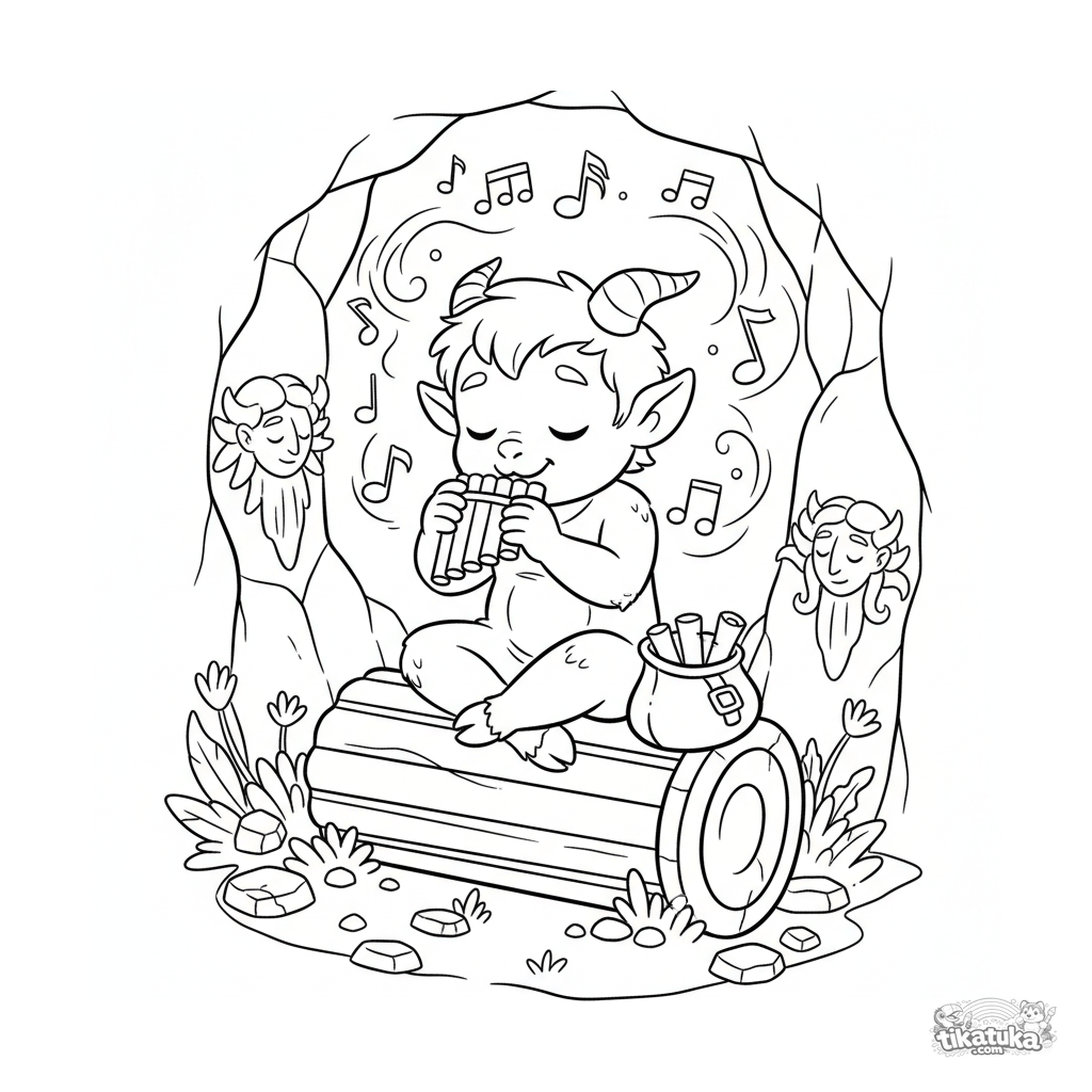 Ausmalbild: ein fröhlicher Satyr spielt Panflöte in der Gorgonenhöhle. Für Kinder von 4-6 Jahren. Zeigt Ziegenhörner, Hufe, Noten und eine Steinsäule.