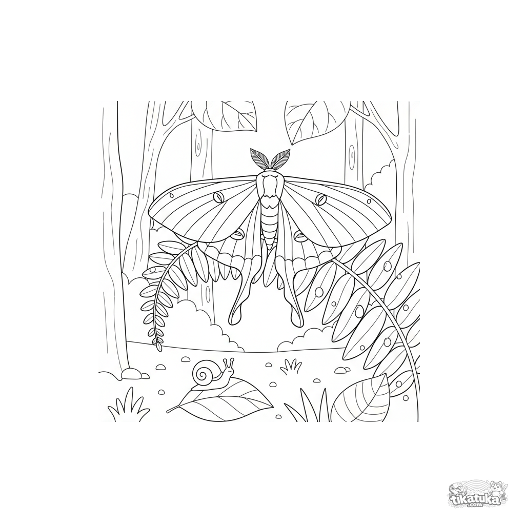 Ausmalbild für Kinder: ein schöner Nachtfalter mit gemusterten Flügeln ruht auf einem Farnblatt im Wald. Für 4-6 Jahre.