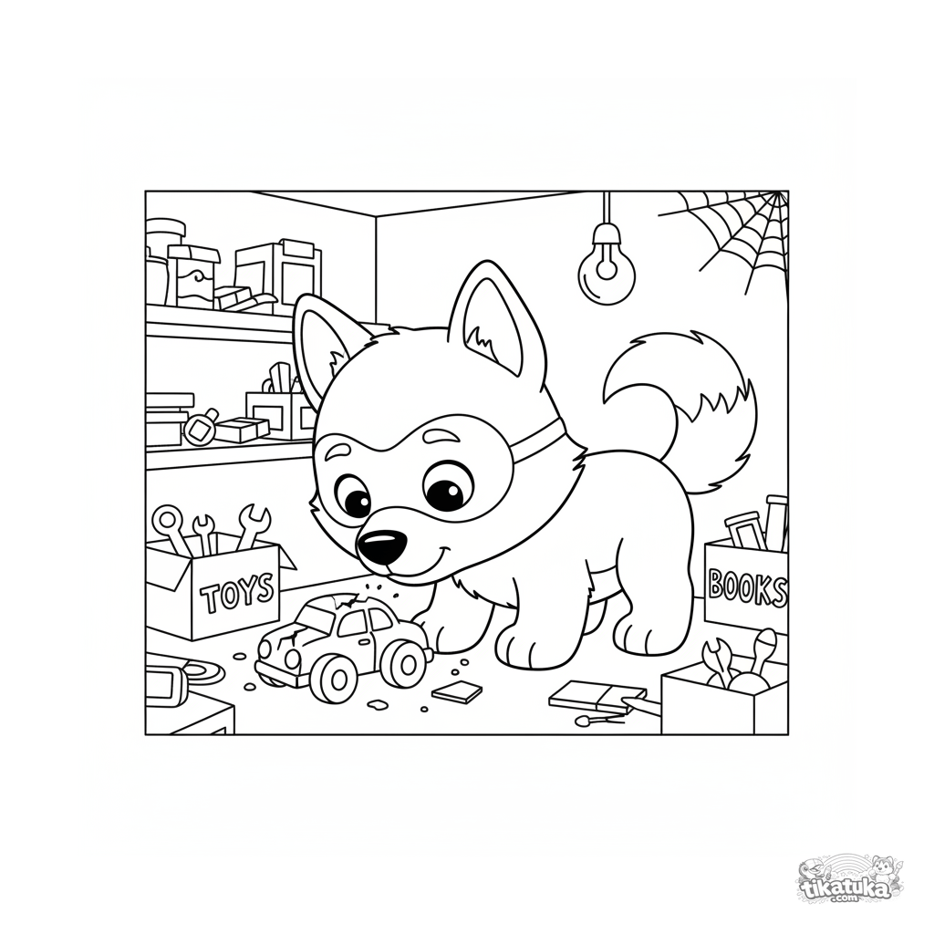 Lutik entdeckt im dunklen Keller ein altes, kaputtes rotes Spielzeugauto. Jetzt herunterladen, ausdrucken oder online ausmalen!
