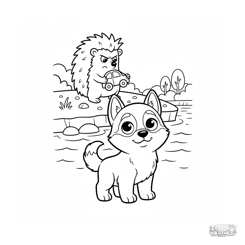 Ausmalbild: Hund Lutik begegnet einem mürrischen Igel am Fluss, der sein Spielzeugauto hält. Zum Herunterladen, Ausdrucken oder Online-Ausmalen.