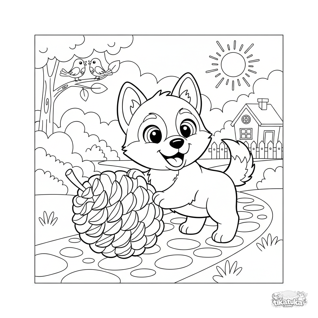 Lutik, der Hund, rollt fröhlich einen großen Tannenzapfen nach Hause. Lade diese Malvorlage herunter, drucke sie aus oder male sie online aus!