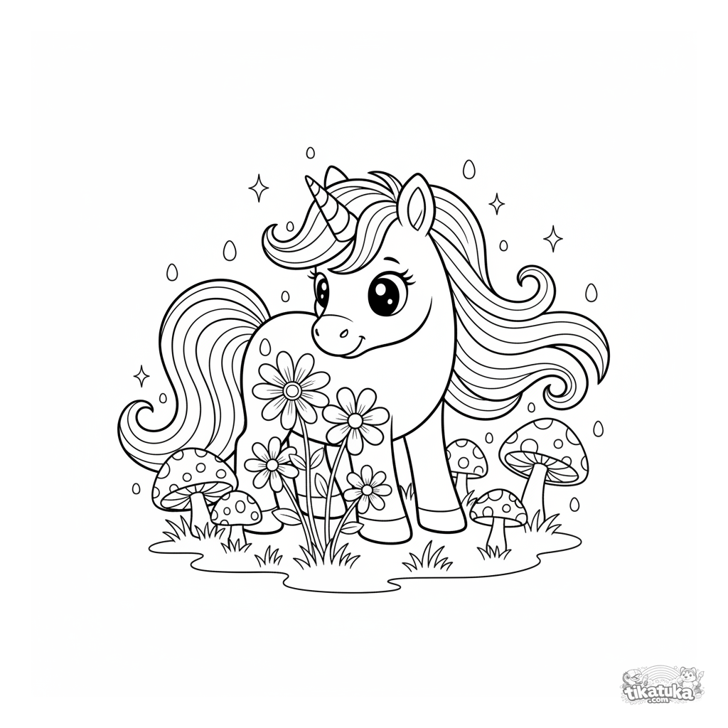 Ausmalbild eines magischen Einhorn-Ponys auf einer verzauberten Wiese. Für Mädchen von 5-7 Jahren. Zeigt ein Pony mit wallender Mähne, Horn und leuchtenden Blumen. Märchenhafte Szene zum Ausmalen.