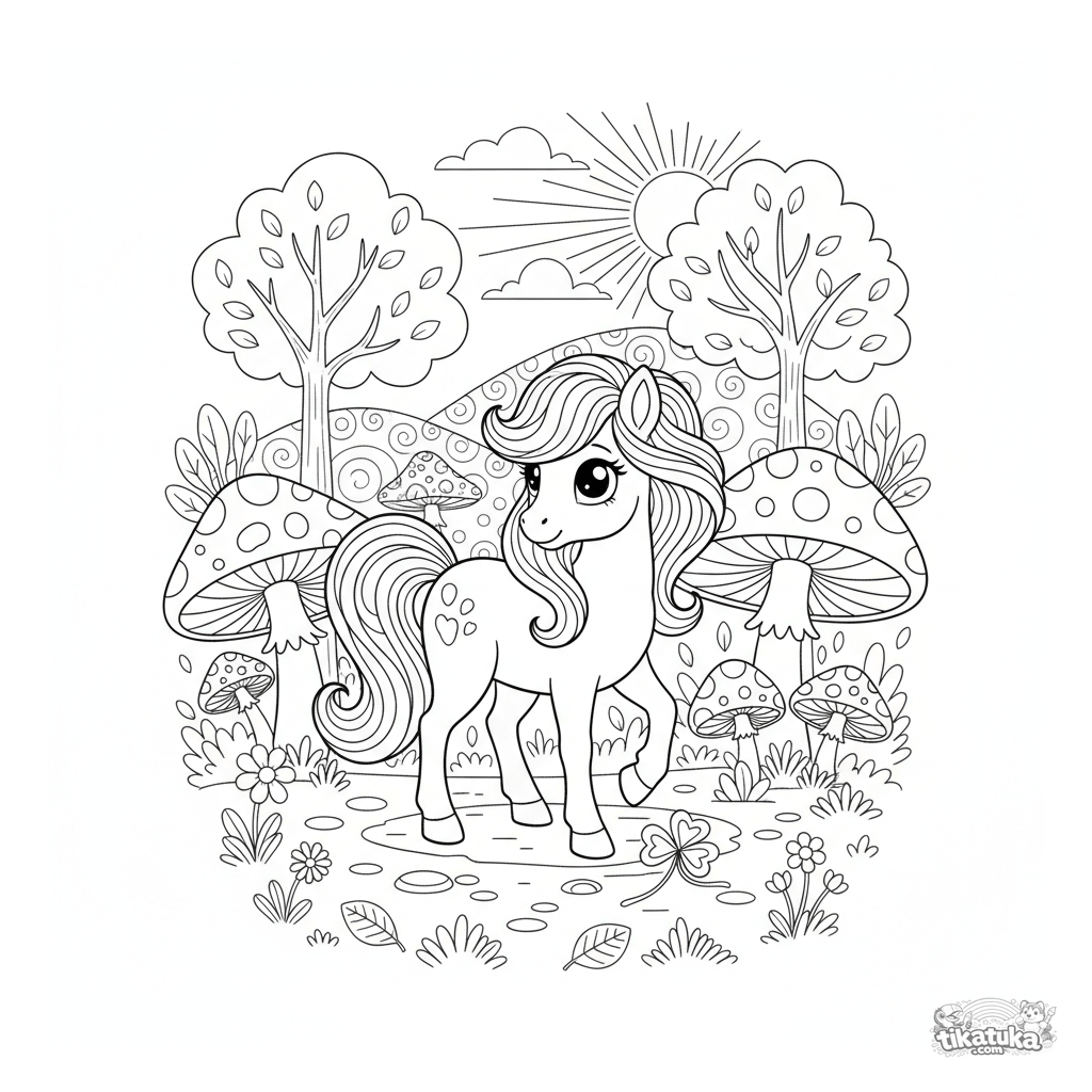 Ausmalbild für ältere Kinder von 7-12 Jahren: ein magisches Pony mit Polarlichter-Mähne grast auf einer Lichtung mit Riesenpilzen. Hoher Detaillierungsgrad, verzauberte Szene.