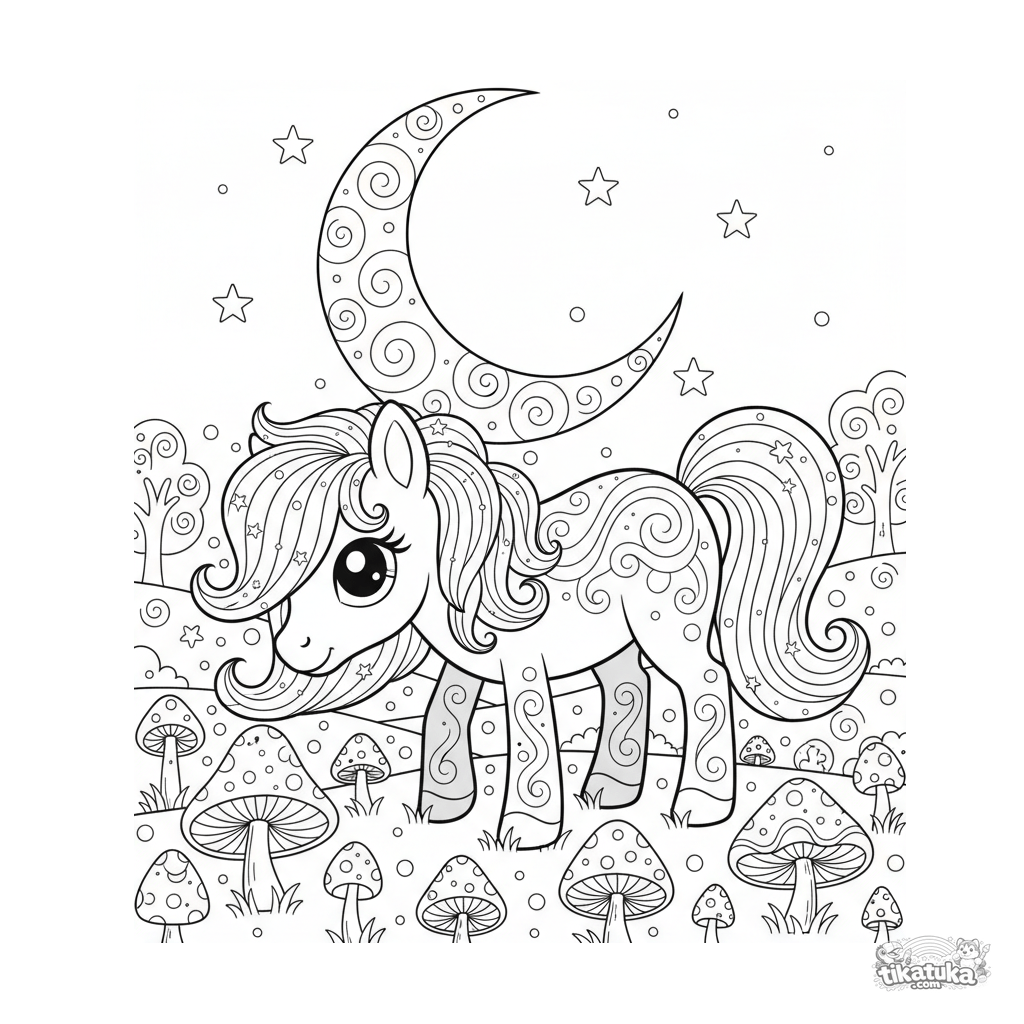 Detailliertes Ausmalbild für ältere Kinder 7-12: Ein magisches Pony mit Nordlicht-Mähne grast auf einer mondbeschienenen Wiese mit leuchtenden Pilzen. Eine verzaubernde Szene.