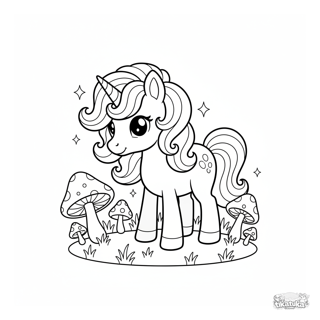 Ausmalbild für Mädchen 4-6: Ein magisches Einhorn-Pony mit einer Mähne wie Regenbogenwolken grast auf einer Wiese mit leuchtenden Pilzen. Eine Märchenszene.