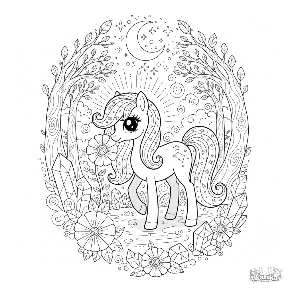 Ausmalbild eines magischen Ponys mit einer fließenden Sternenlicht-Mähne, das in einem mondbeschienenen Hain grast. Detailliert für Kinder von 8-12 Jahren.
