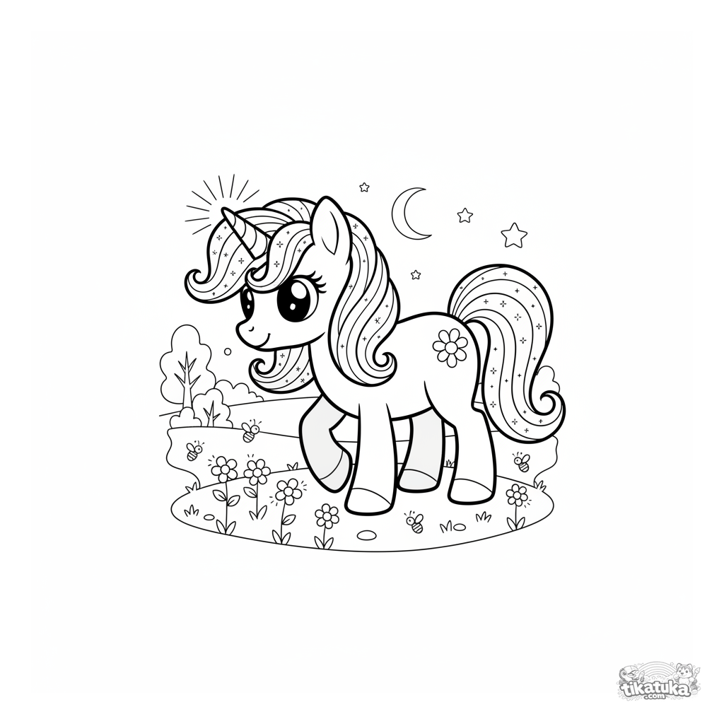 Ausmalbild für Mädchen 4-6: Ein magisches Pony mit Sternenstaubmähne grast auf leuchtenden Blumen in einer Dämmerungswiese. Schöne Szene.