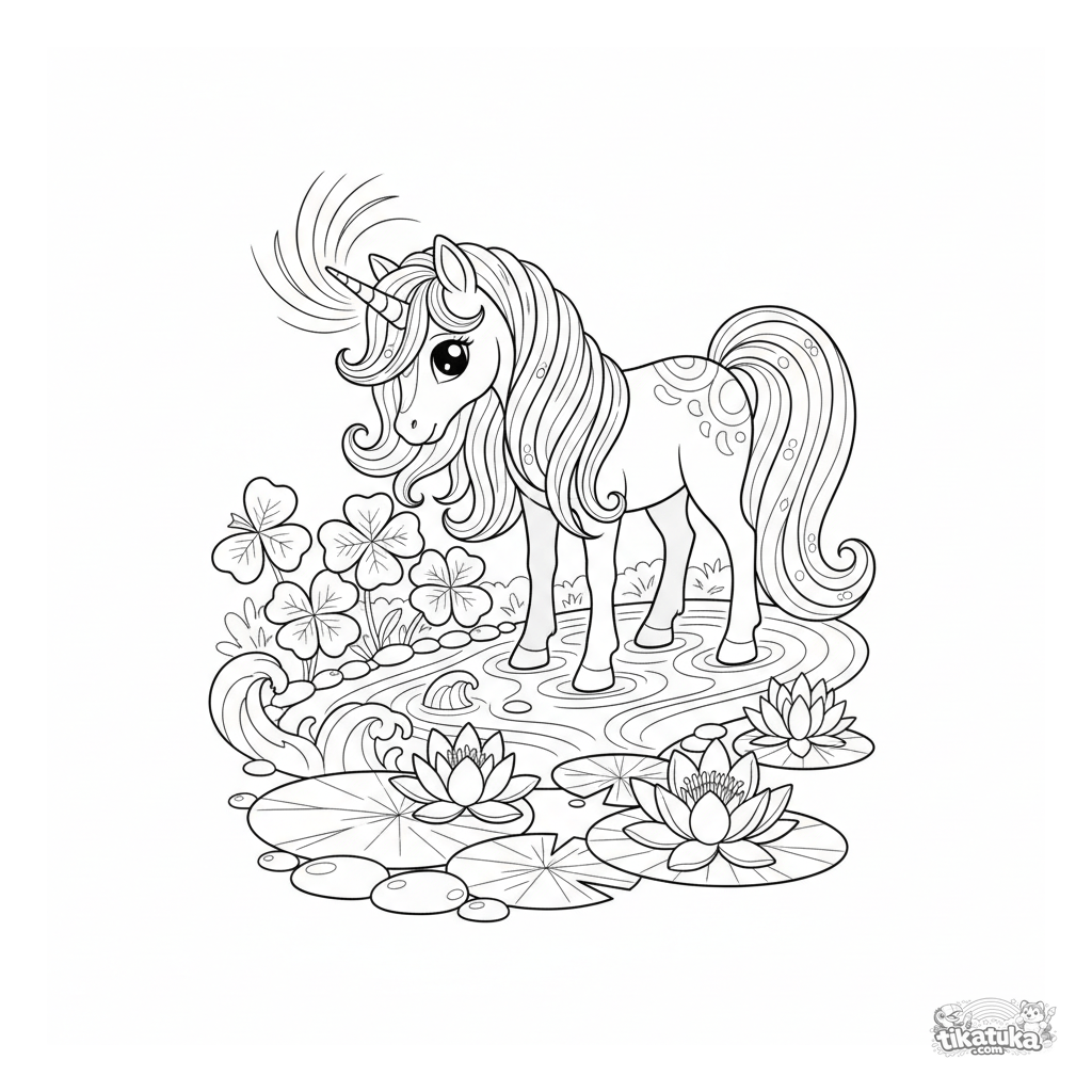 Ausmalbild eines magischen Ponys mit einer wasserähnlichen Mähne, das an einem Bach grast. Eine verzauberte, detaillierte Szene für Kinder von 6-9 Jahren.