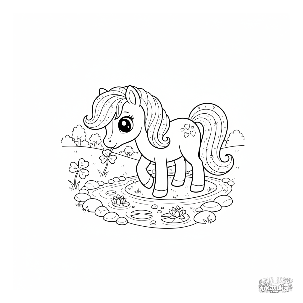 Ausmalbild eines magischen Ponys, das an einem Kristallbach grast. Für Mädchen von 4-6 Jahren, eine märchenhafte Szene.
