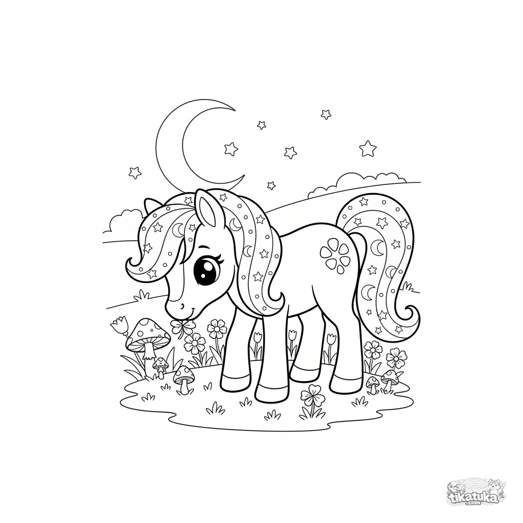 Ausmalbild eines magischen Ponys, dessen Mähne mit Sternen schimmert. Für Mädchen von 5-7 Jahren. Eine niedliche Szene einer mondbeschienenen Wiese.