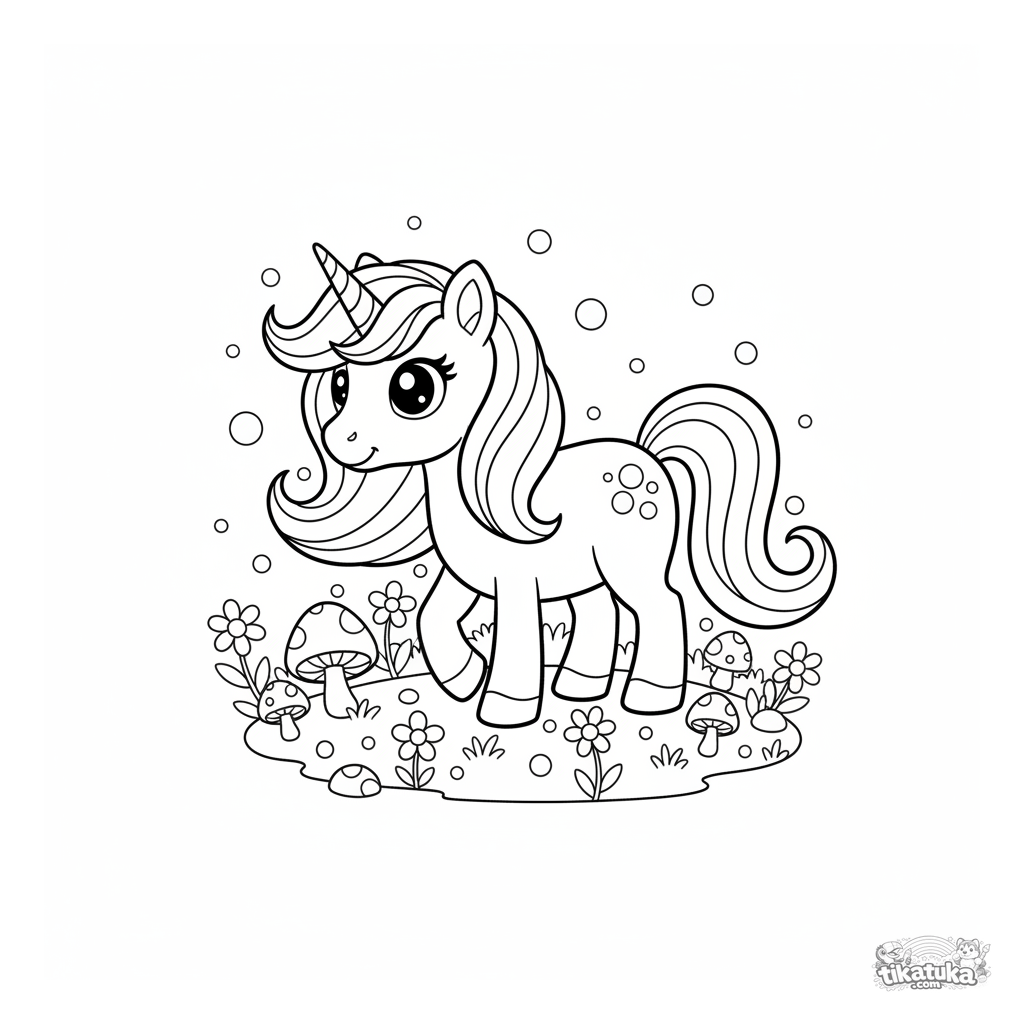 Ein magisches Einhorn-Pony Ausmalbild für Mädchen von 4-6. Das Pony mit Kristallhorn grast auf einer verzauberten Wiese mit leuchtenden Pilzen.