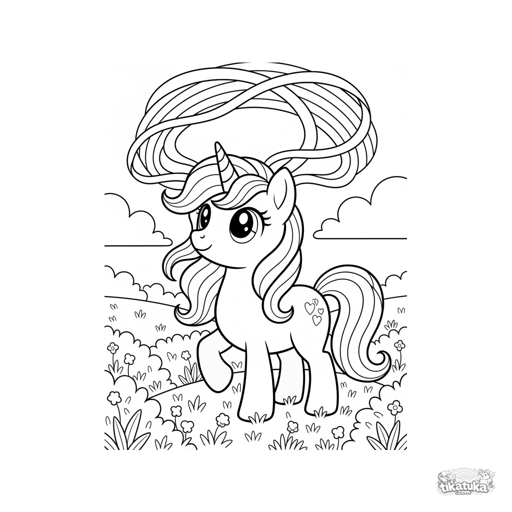 Ausmalbild für Mädchen 4-6: Ein magisches Einhorn-Pony mit Kristallhorn webt einen Regenbogen aus Lichtfäden auf einer blumigen Wiese. Eine schöne, sanfte Fantasieszene.
