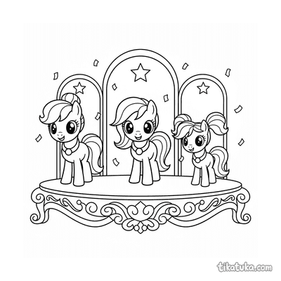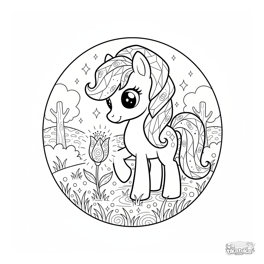 Ein Ausmalbild zum Thema Ponys mit Detailgrad Schwer. Es passt für das Alter 7+ Jahre, lässt sich gut zu Hause drucken und sofort online öffnen.