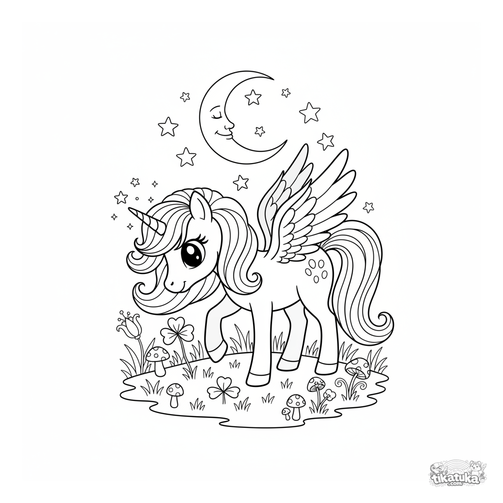 Magisches Ausmalbild mit einem Pony für Mädchen von 4-6 Jahren. Ein anmutiges Pony mit gefiederten Flügeln und einem Horn grast friedlich Klee im Mondlicht.