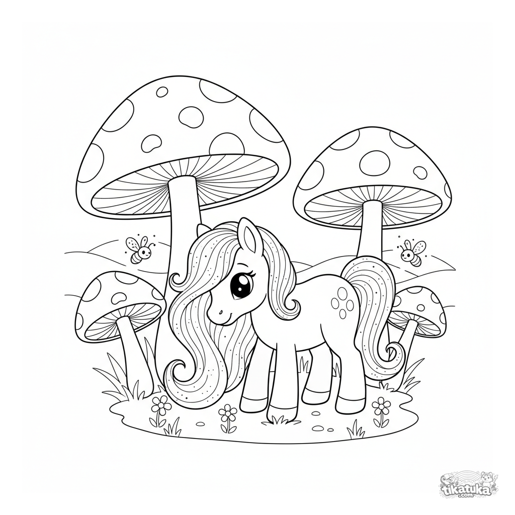 Ausmalbild eines magischen Ponys mit glitzernder Mähne, das auf einer verzauberten Pilzwiese grast. Für Mädchen von 4-6 Jahren.