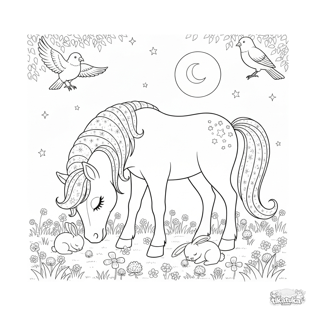 Ausmalbild eines magischen Ponys, das im Mondlicht auf einer Wiese grast. Für Kinder von 6-9 Jahren. Glitzernde Mähne, leuchtende Blumen und schlafende Hasen.