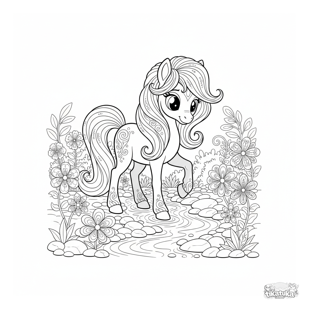 Ausmalbild eines magischen Ponys mit funkelnder Mähne an einem klaren Bach. Für Kinder von 6 bis 9 Jahren.