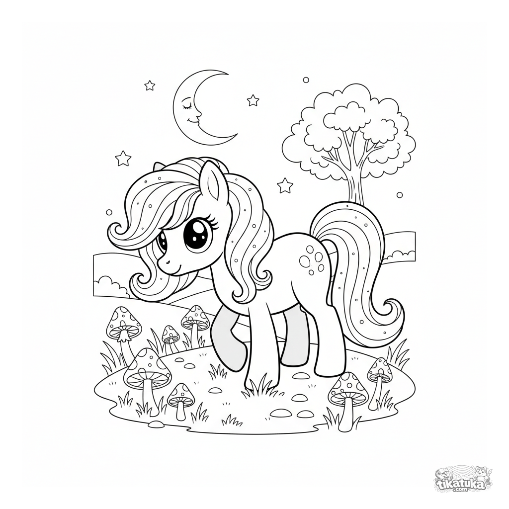 Ausmalbild für Mädchen von 4-6 Jahren: ein magisches Pony mit glitzernder Mähne grast auf einer mondbeschienenen Wiese. Eine märchenhafte und friedliche Szene.