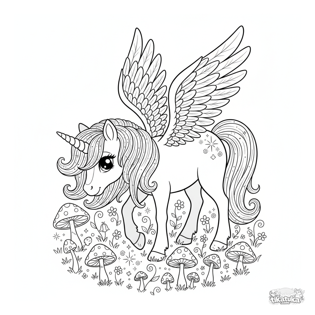 Ausmalbild eines magischen, geflügelten Einhorn-Ponys auf einer verzauberten Wiese. Für Kinder von 6-9 Jahren. Enthält leuchtende Pilze, magischen Staub und glockenblumenförmige Blumen.