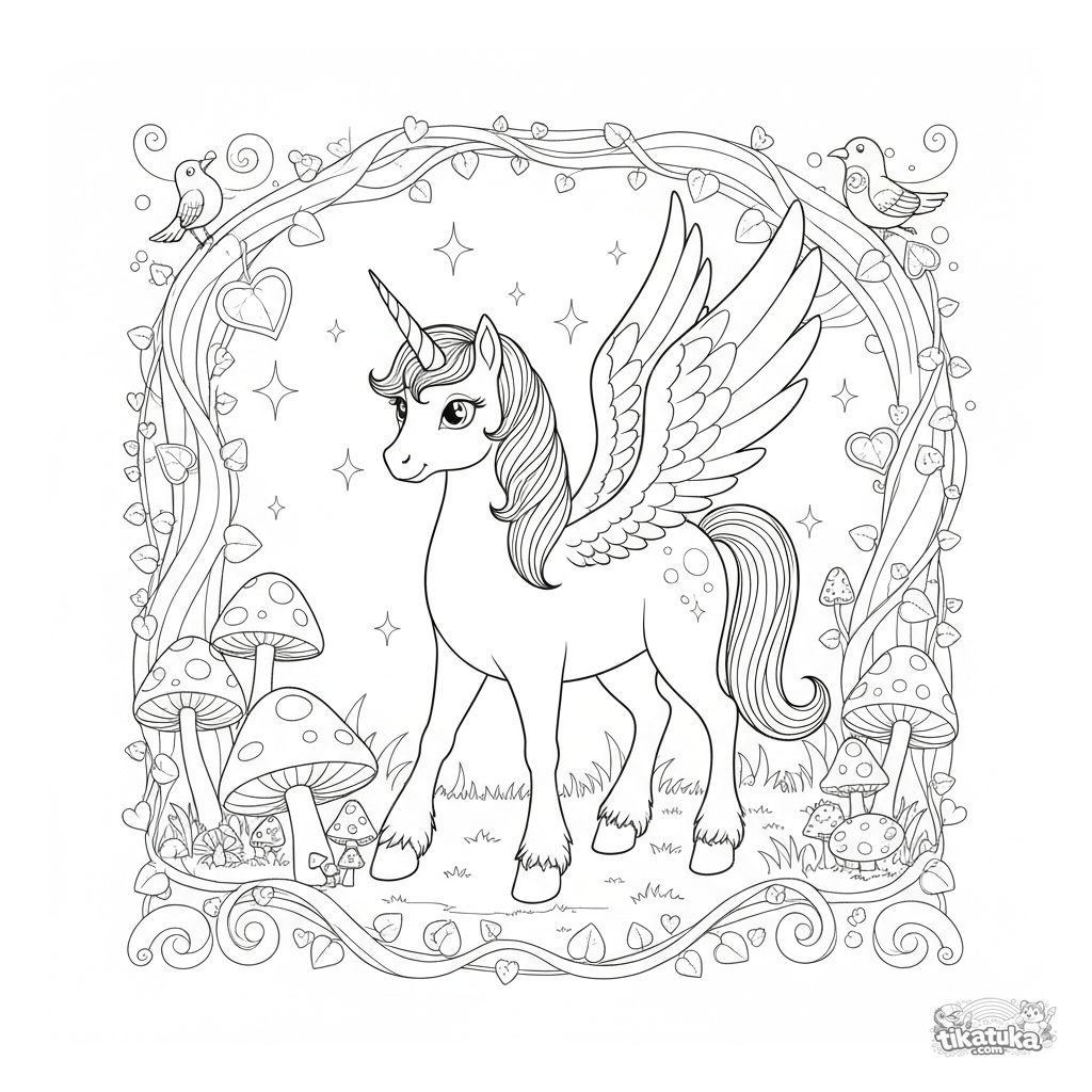 Ausmalbild eines magischen geflügelten Einhorn-Ponys im verzauberten Hain. Für Kinder von 6-9 Jahren. Hoher Detaillierungsgrad mit Pilzen und Ranken.
