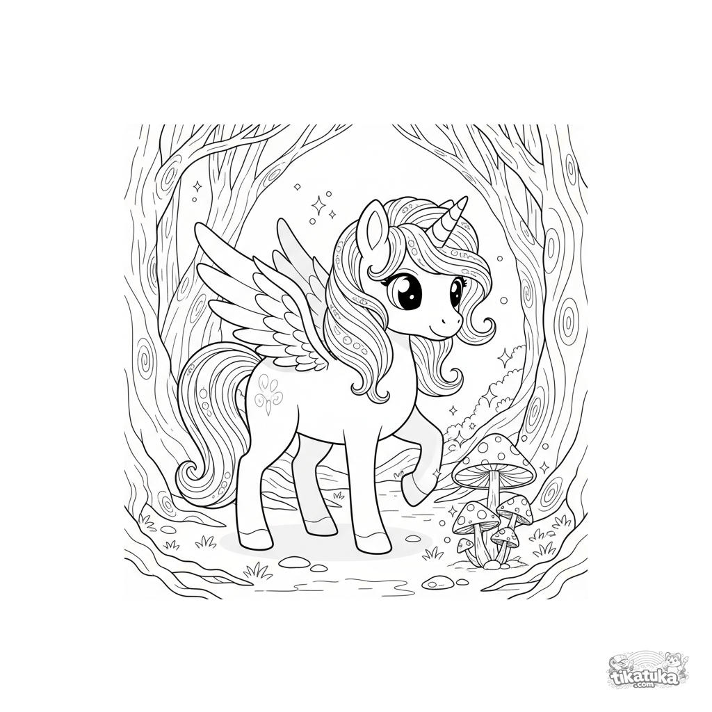 Ausmalbild eines magischen geflügelten Einhorn-Ponys im verzauberten Wald. Für Kinder von 5-8 Jahren. Das Pony schaut auf leuchtende Pilze, funkelnde Lichter schweben umher und uralte Baumwurzeln sind sichtbar.