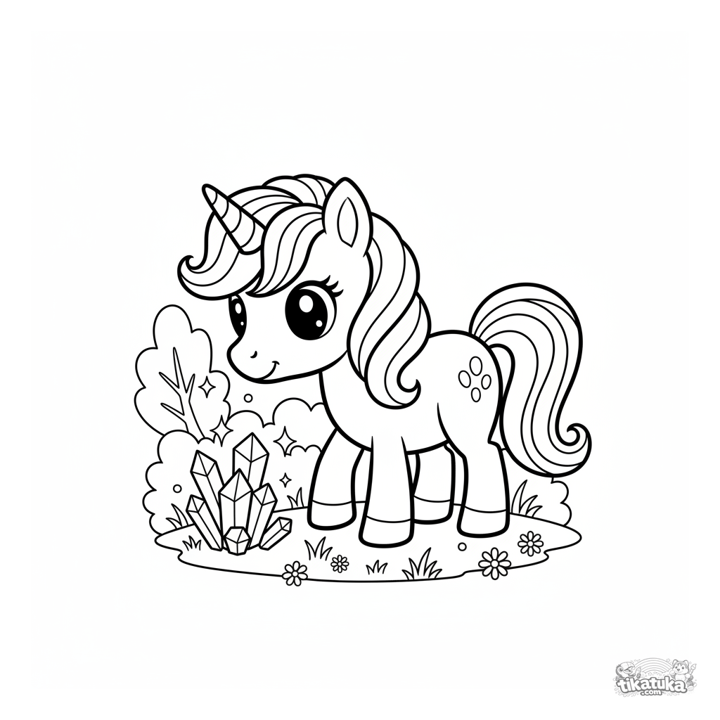 Ausmalbild für Mädchen: Ein süßes Einhorn-Pony grast auf einer verzauberten Wiese mit Kristallblumen. Geeignet für 5-7 Jahre, mittlerer Schwierigkeitsgrad.