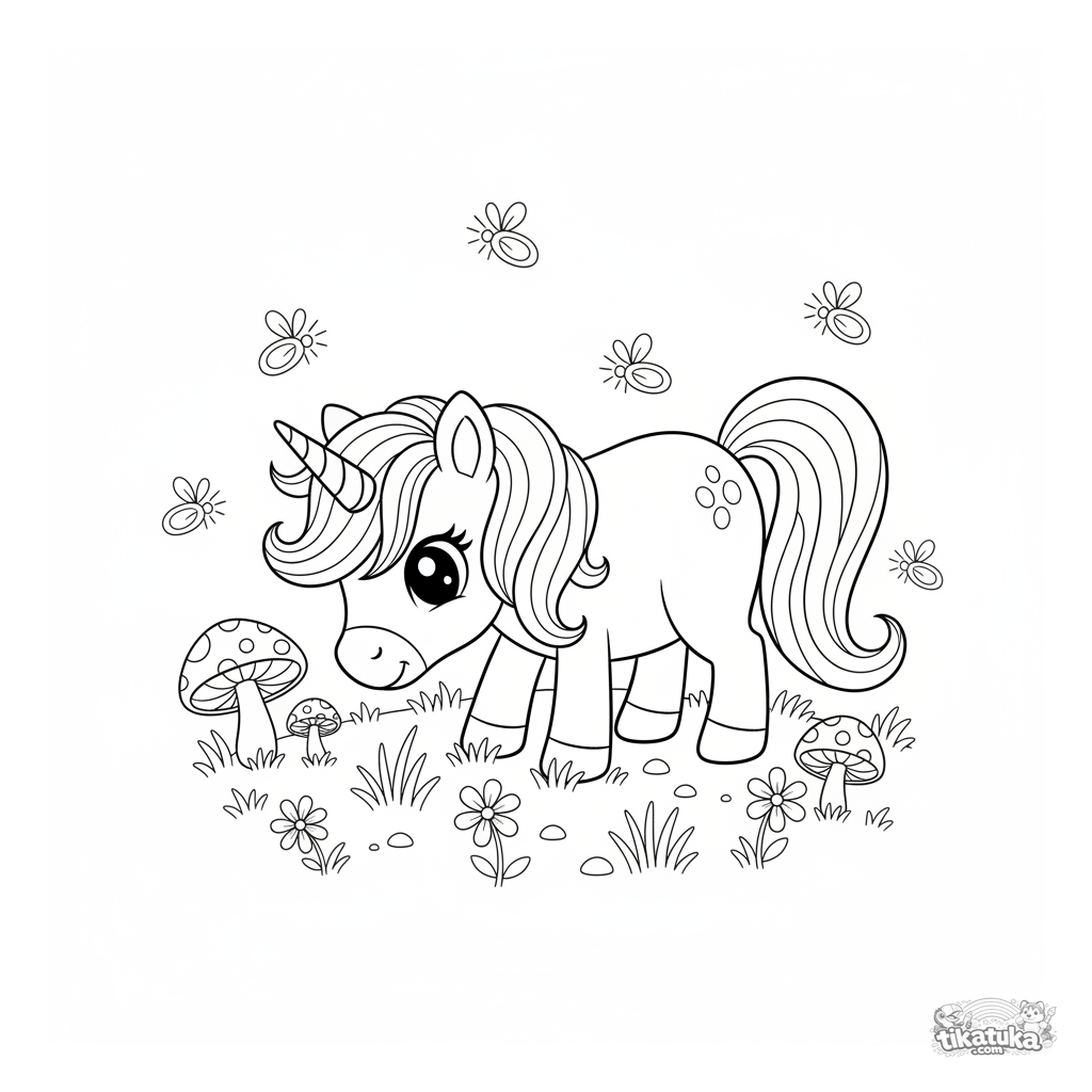 Ausmalbild für Mädchen von 4 bis 6 Jahren. Ein magisches Einhorn-Pony mit welliger Mähne weidet auf einer mondbeschienenen Wiese zwischen leuchtenden Pilzen. Eine märchenhafte Szene.
