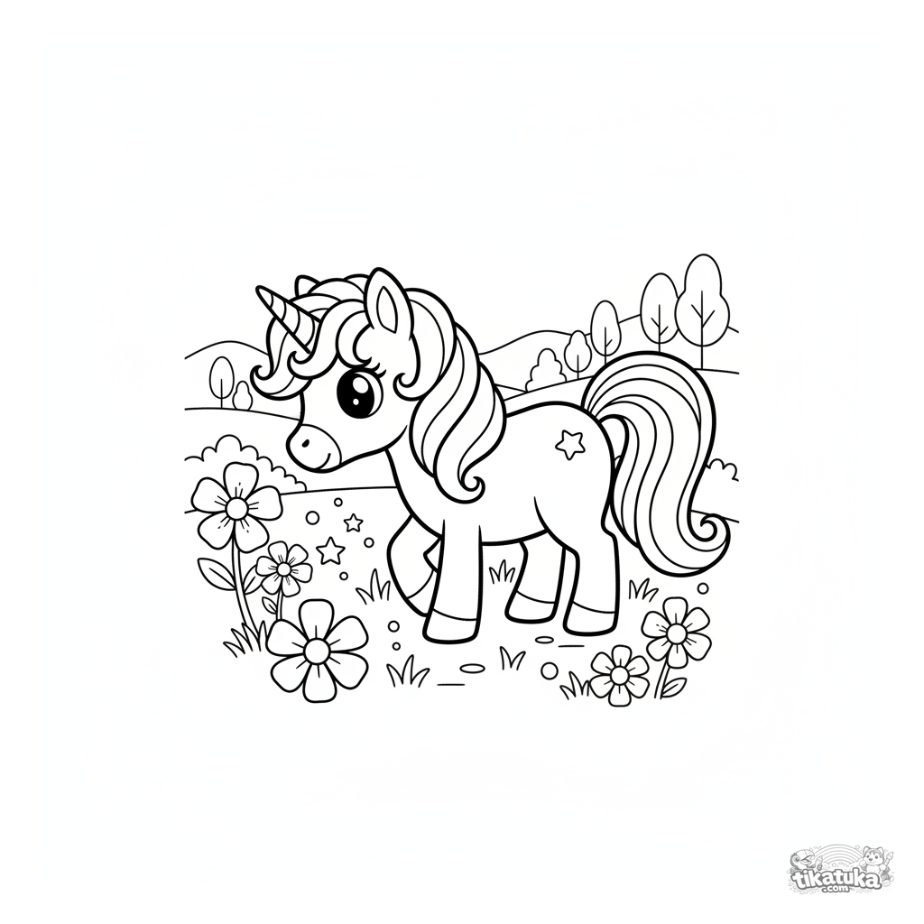 Ausmalbild für Mädchen 4-6: Ein magisches Einhorn-Pony grast auf einer verzauberten Wiese mit leuchtenden Blumen. Eine süße, einfache Fantasieszene.