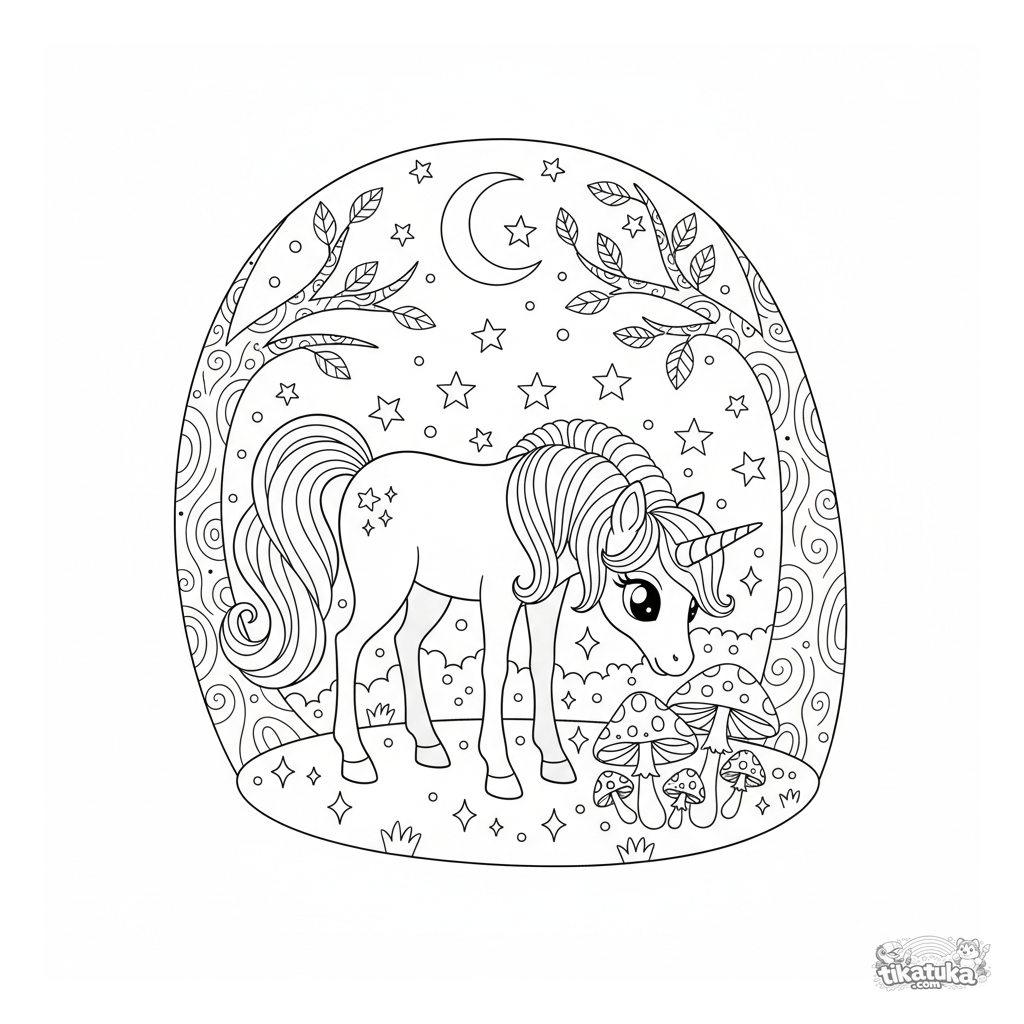 Ausmalbild für Kinder 8-12: Ein magisches Einhorn-Pony grast an leuchtenden Pilzen auf einer verzauberten Lichtung unter Sternen. Eine komplexe, detaillierte Szene.