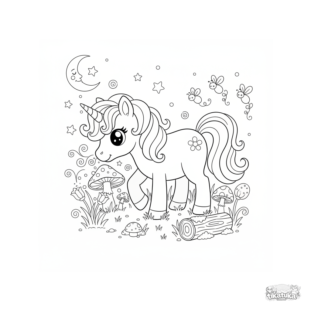 Ausmalbild eines magischen Einhorn-Ponys auf einer verzauberten Wiese. Für Kinder von 3-6 Jahren. Leuchtende Pilze, Glühwürmchen und Magiestaub ergeben eine Märchenszene.