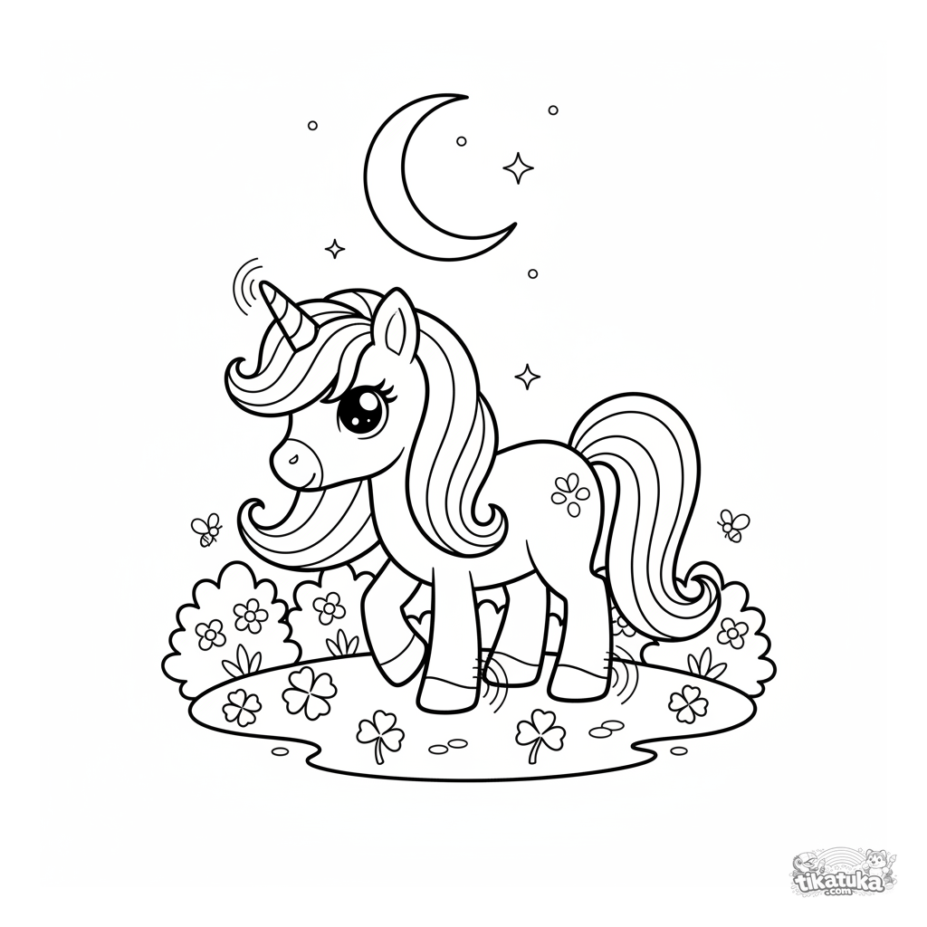Ausmalbild für Mädchen: Ein magisches Einhorn-Pony mit leuchtenden Hufen weidet im Mondschein. Für 5-7 Jahre.
