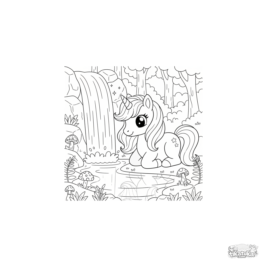 Ausmalbild für Mädchen 4-6: Ein magisches Einhorn-Pony ruht an einem funkelnden Wasserfall in einem verzauberten Wald. Ein Märchenmotiv mit einfachen Linien.
