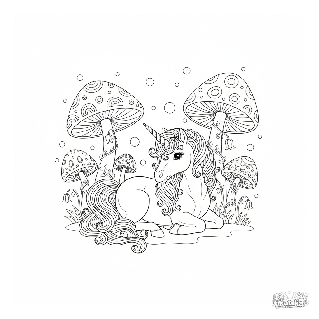 Detailliertes Ausmalbild für Mädchen 7-12: Ein magisches Einhorn ruht in einem Hain mit Riesenpilzen. Komplexes Design mit magischen Elementen.