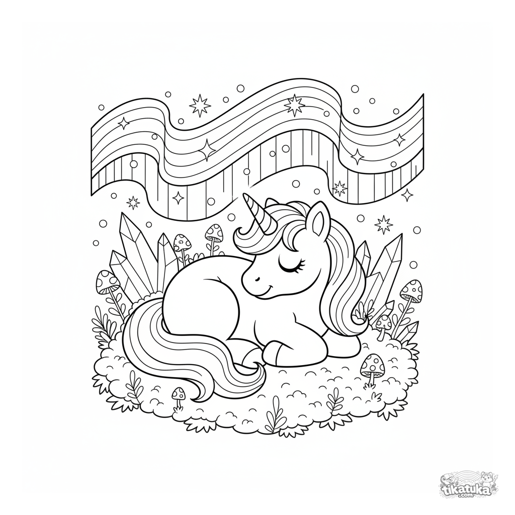 Ausmalbild eines magischen Einhorn-Ponys, das unter funkelnden Nordlichtern schläft. Für Kinder von 5 bis 8 Jahren.