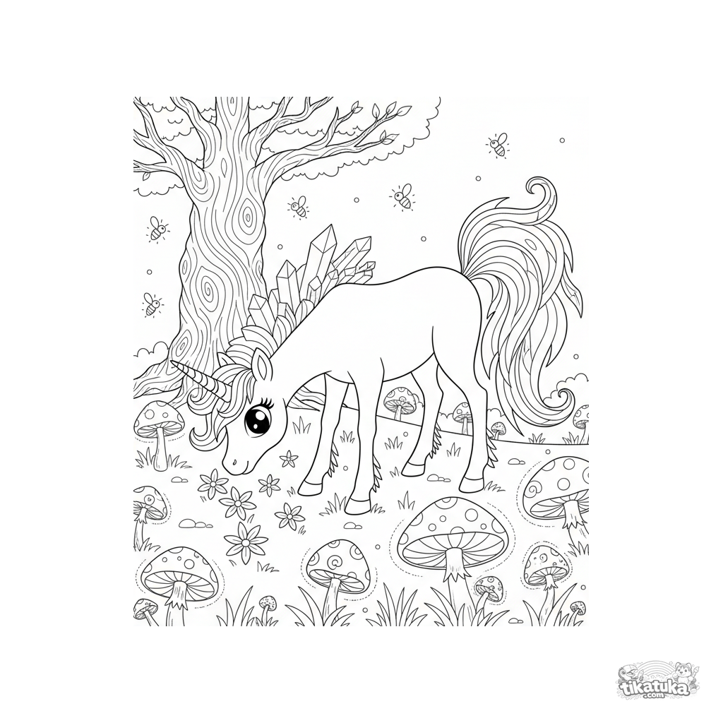 Ausmalbild eines magischen Einhorn-Ponys mit Kristallmähne, das auf einer mondbeschienenen Wiese zwischen leuchtenden Pilzen grast. Für Kinder von 6 bis 9 Jahren.